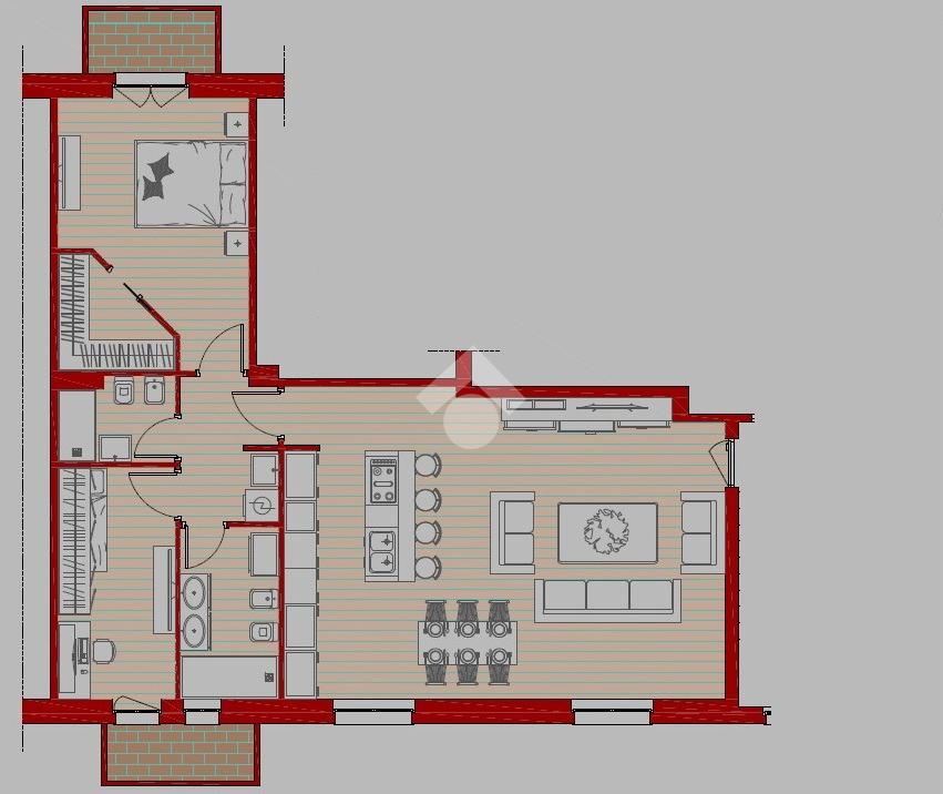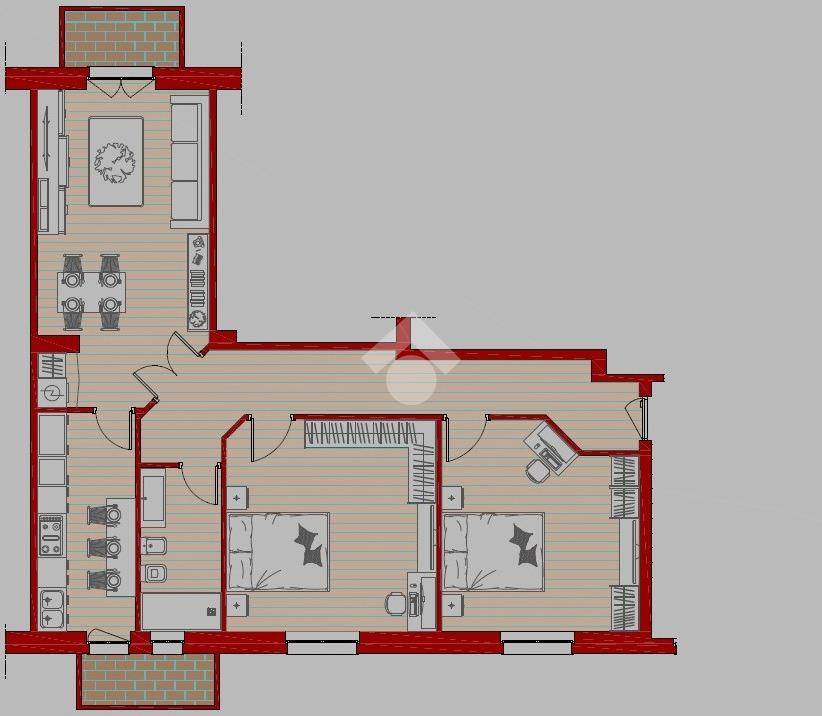 L'appartamento attualmente è composto da ingresso, soggiorno, due camere da letto matrimoniali, cucina, bagno, ripostiglio e due balconi. Gli affacci sono doppi e garantiscono un’ottima luminosità.
